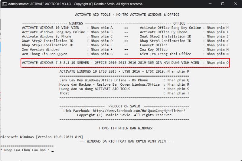 - Hành động 5: Bấm phím T để AIO Tool tự động gia hạn bản quyền Windows, Office (Kích hoạt vĩnh viễn)