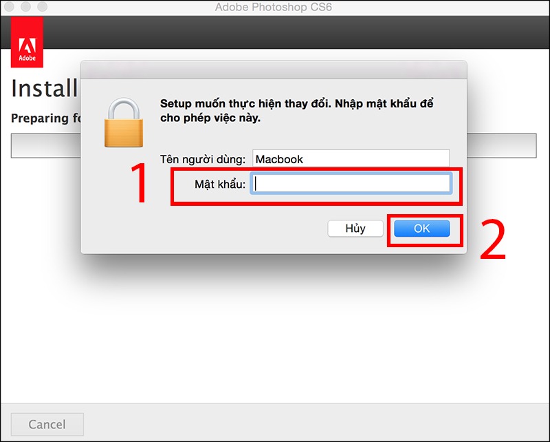 Điền mật khẩu của máy tính vào ô trống rồi nhấn OK để chương trình cài đặt có thể chạy. Quá trình cài đặt sẽ tốn khoảng vài phút.